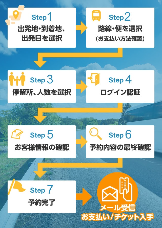 お客様の登録されているメールアドレス宛にご予約内容を記載したメールが送信されますので、購入期限までに決められた場所で乗車券を購入してください。