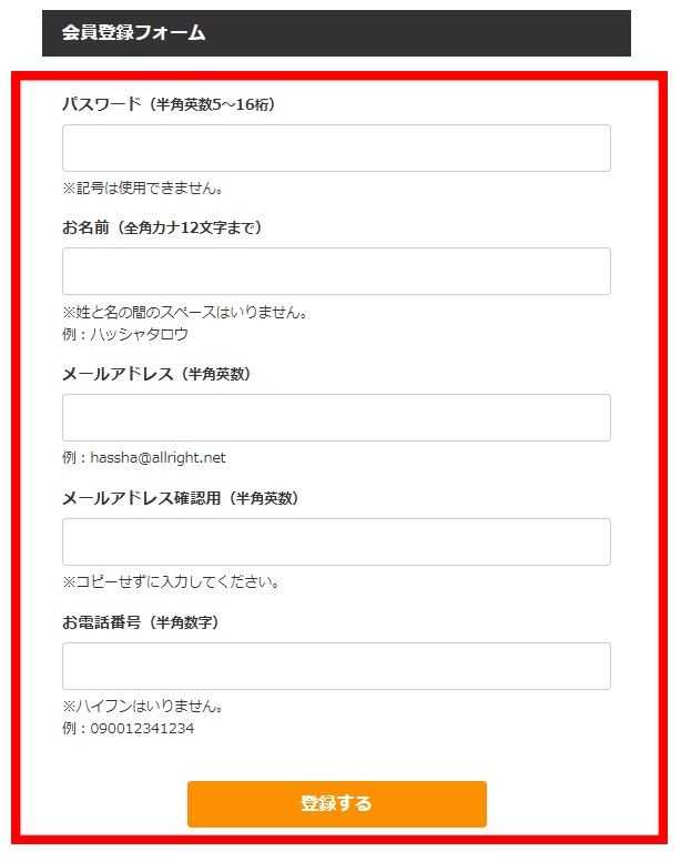 会員規約に同意後、お客様情報(パスワード、お名前、メールアドレス、電話番号)を入力し、会員登録を行ってください。